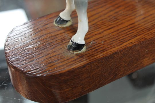 Later painted. Face probably re-touched. Feet glued to later oak plinth. Small flake of paint missing to jacket. Otherwise good with no apparent cracks or repairs.