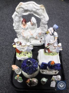A tray of Staffordshire figures and houses, continental figures, Yardley figure and soap dish