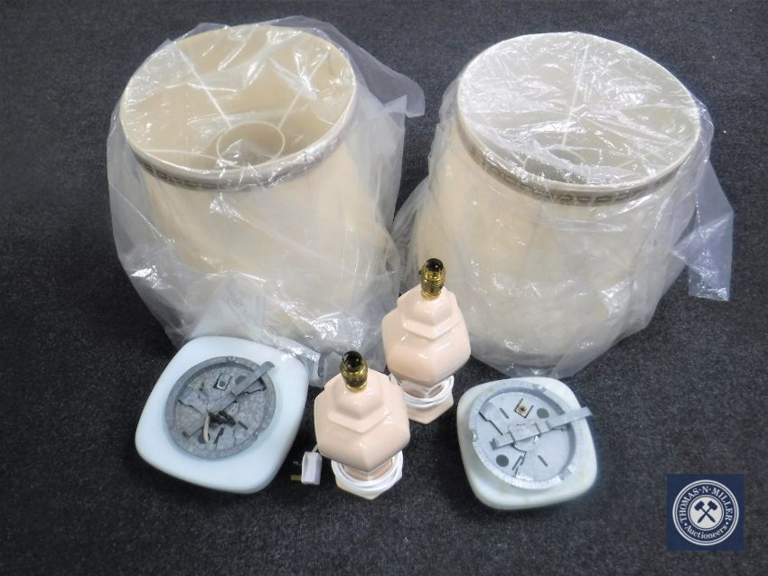 A box containing two light fittings with opaque glass shades, two pottery table lamps, together with two standard lamp shades