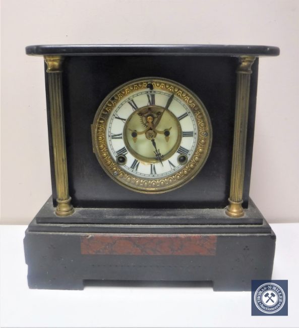 A Victorian black slate mantel clock with brass and enamelled dial