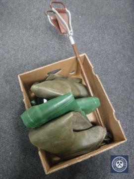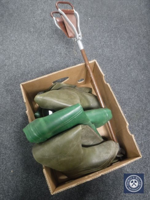 Two pairs of fishing waders and a shooting stick