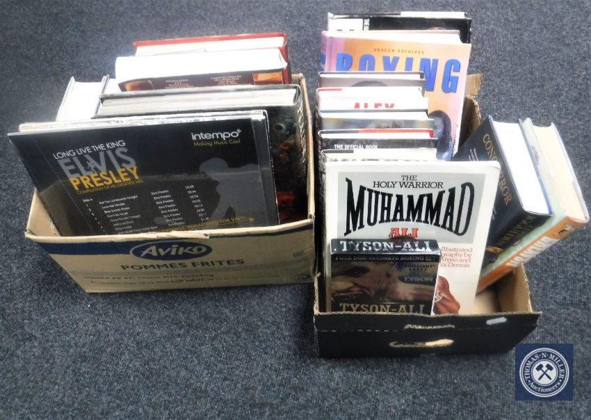 Two boxes of LP records, books, CD's and DVD's relating to boxing and rock 'n roll