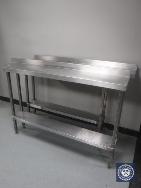 Two narrow stainless steel two tier catering tables