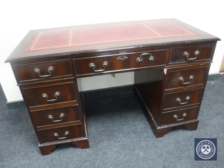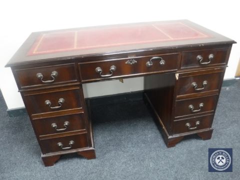 A reproduction mahogany twin pedestal writing desk with tooled leather top