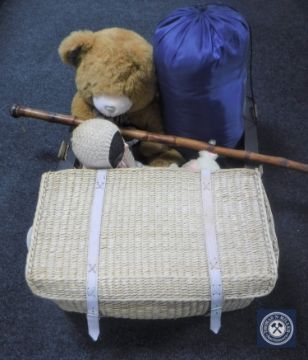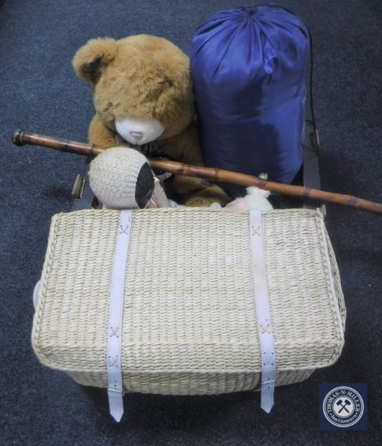 A box of mid 20th century dolls, teddy bears, sleeping bag, bamboo walking stick and set of graduated wicker baskets
