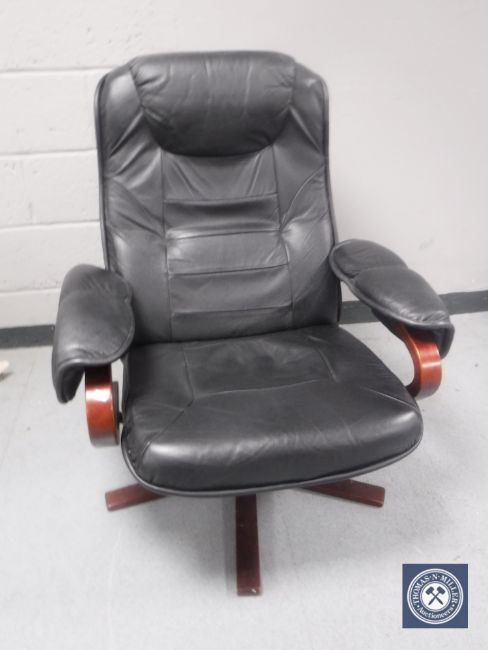 A black leather swivel relaxer chair