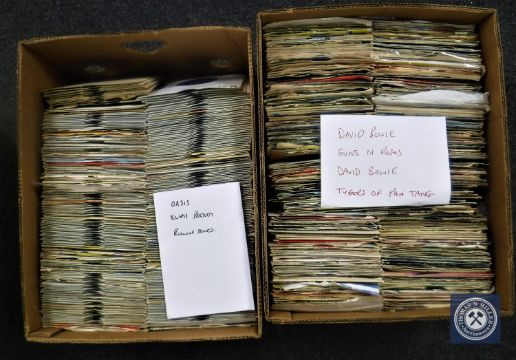Two boxes containing 7" singles including David Bowie, Guns 'N Roses, Oasis, Elvis Presley