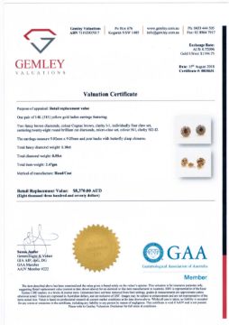 A pair of 14ct yellow gold diamond halo earrings, the two brilliant-cut, cognac brown diamonds weighing a total of 1.10 carat within claw settings, set with twenty-eight brilliant-cut diamonds weighing a total of 0.55 carat, of SI2-I2 clarity and H-I colour, with certification