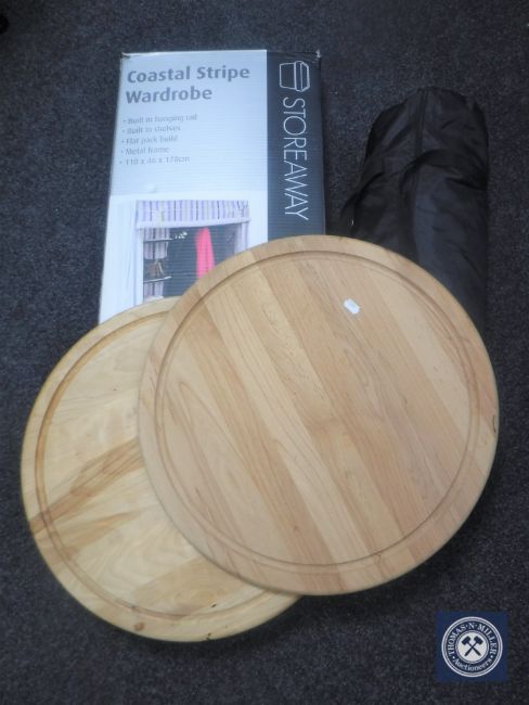 A boxed hanging wardrobe, golf net in carry bag and two lazy Susans
