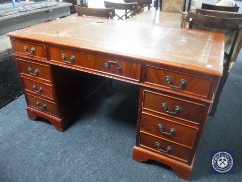 A reproduction twin pedestal desk fitted nine drawers with a tooled leather inset panel