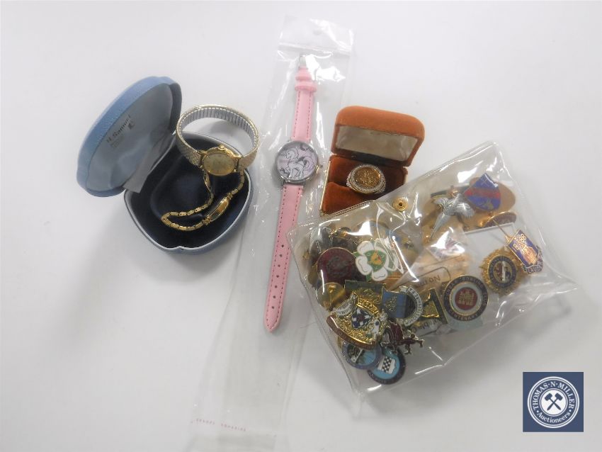 A box containing a quantity of enamel badges, silver gilt ring, lady's wristwatches