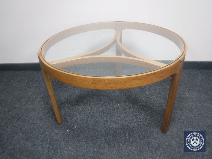 A circular teak glass topped coffee table