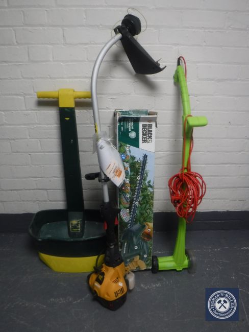 A JCB petrol strimmer together with an electric strimmer, Black & Decker hedge trimmer and a seeding trolley