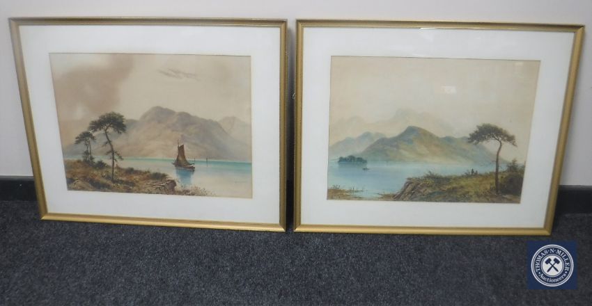 William Baker (1863 - 1937) : A sailing boat on calm waters with mountains beyond, watercolour, signed, 40 cm x 53 cm, together with the companion piece, both parts framed. (2)