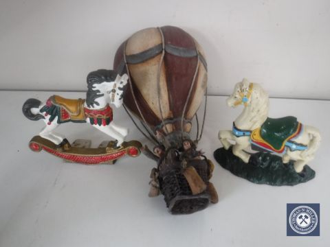 A wooden hot air balloon with basket together with two miniature cast iron horse door stops