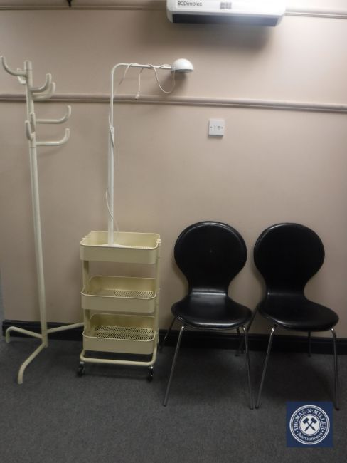 A pair of black leather dining chairs on chrome legs, hair dressers trolley, hat & coat stand and a reading lamp