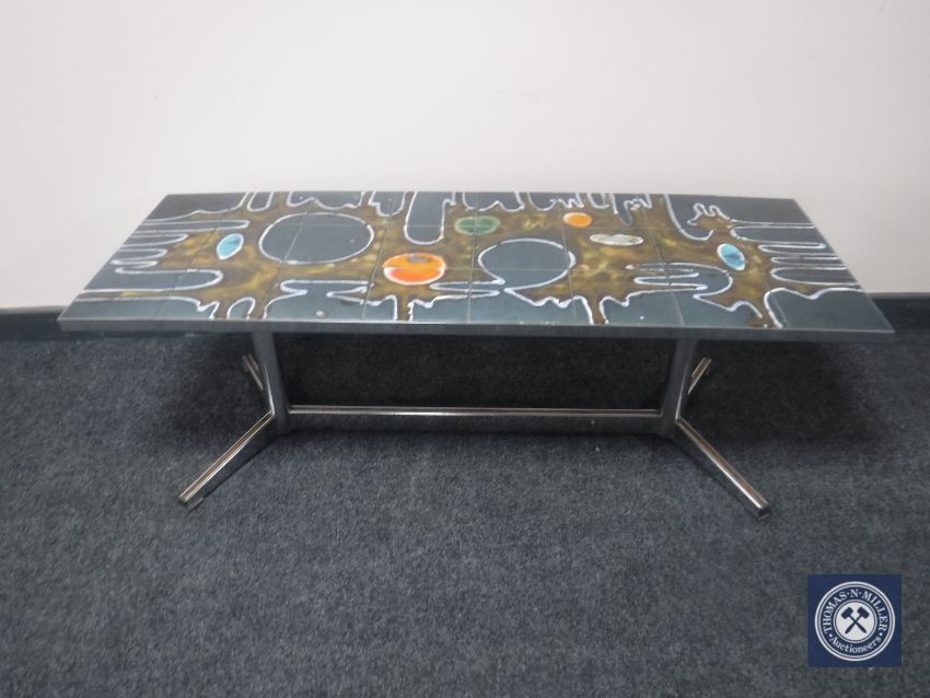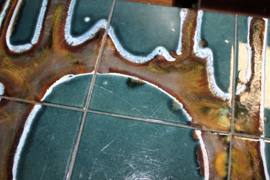 A couple of tiles have hairline cracks near the corners. Other tiles with fine surface scratches. Base with spots of rust but otherwise good.