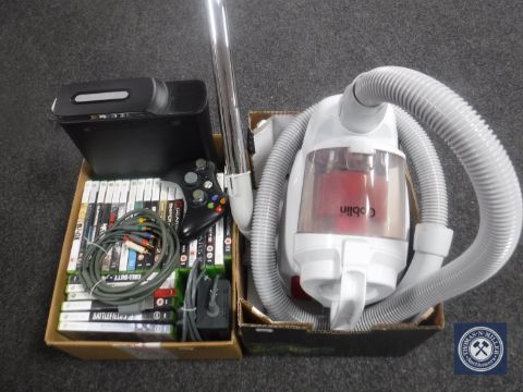 Two boxes containing an Xbox 360 together with approximately 25 games, leads and accessories, vacuum cleaner
