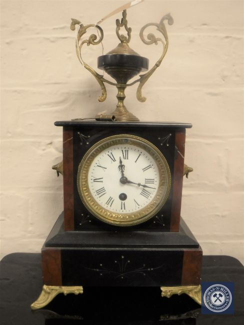 A Victorian marble and slate mantel clock on brass feet surmounted by an urn, with key