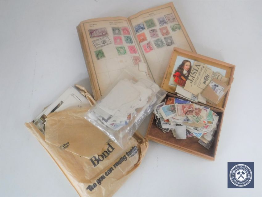 A tray containing a quantity of assorted stamps, photographs, postcards etc
