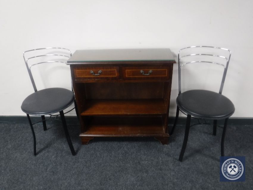 A set of reproduction inlaid mahogany open bookshelves fitted two drawers together with a pair of leather seated kitchen chairs