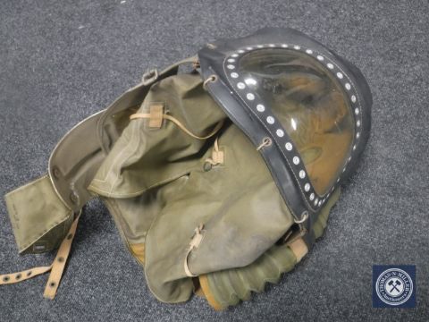 A vintage baby's gas mask and a gas mask in tin