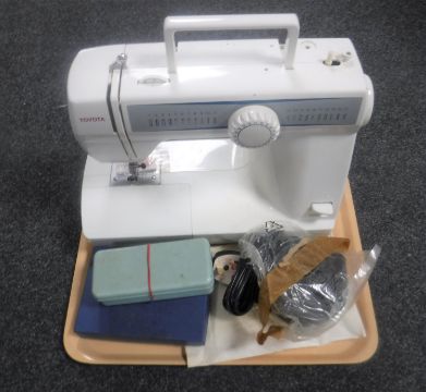 A Toyota electric sewing machine with foot pedal and accessories together with a boxed hip flask