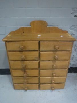 A pine wall cabinet fitted twelve drawers