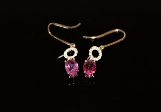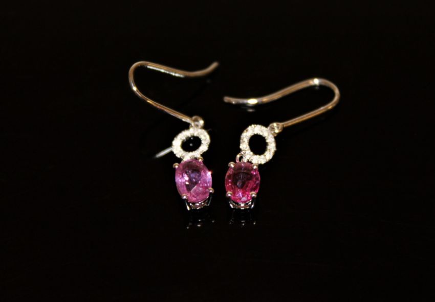 A pair of 14ct yellow gold sapphire and diamond earrings, two oval-cut pink sapphires with a total weight of 1.72 carat, set with twenty-two brilliant-cut diamonds totalling 0.15 carat, of P1/P2 clarity and G-I colour, with certification