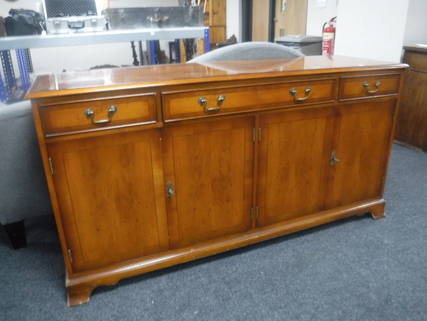 An inlaid yew wood four door sideboard fitted three drawers