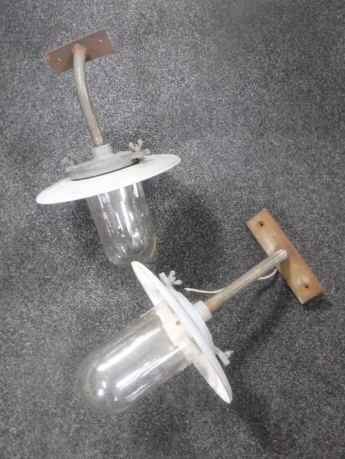 A box containing vintage Revo industrial wall lights