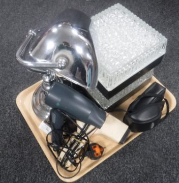 A tray containing banker's style desk lamp, two outdoor wall lights, camera etc