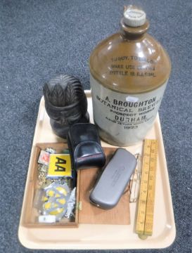 An early 20th century stoneware flagon, marked 'A. Broughton, Botanical Brewer, Durham', together with a box containing two AA badges, enamel badges, costume jewellery, folding metal rule, carved wooden head