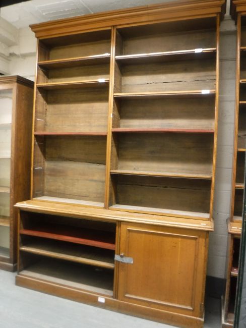 A Victorian oak bookcase fitted with a panelled cupboard below, width 201 cm, height 290 cm