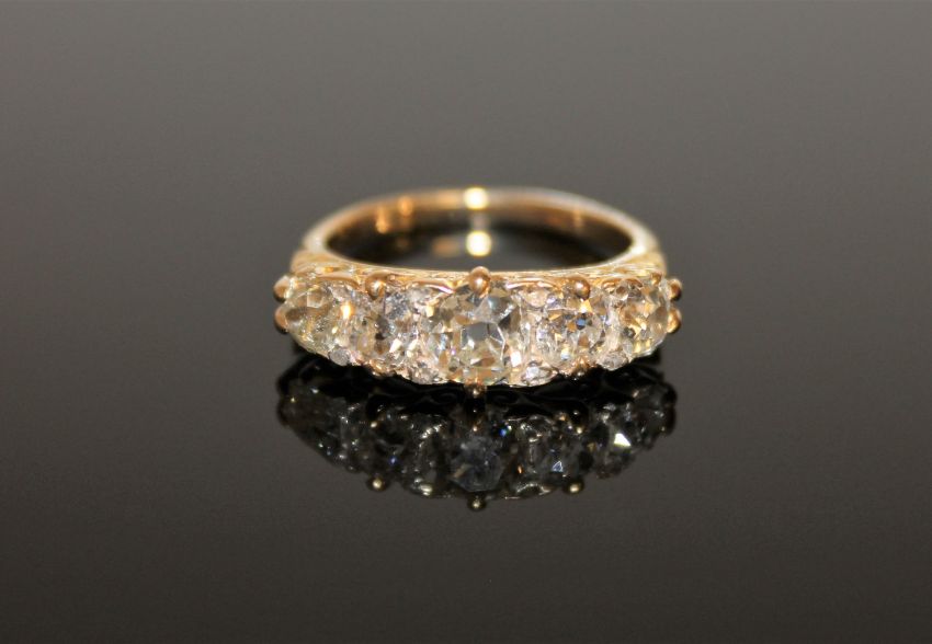 A five-stone old cut diamond ring, the total diamond weight estimated at 1.7 carat, size M