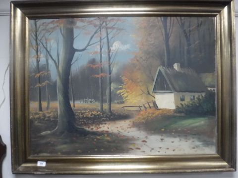 A gilt framed continental school oil on canvas, cottage in woodland, indistinctly signed