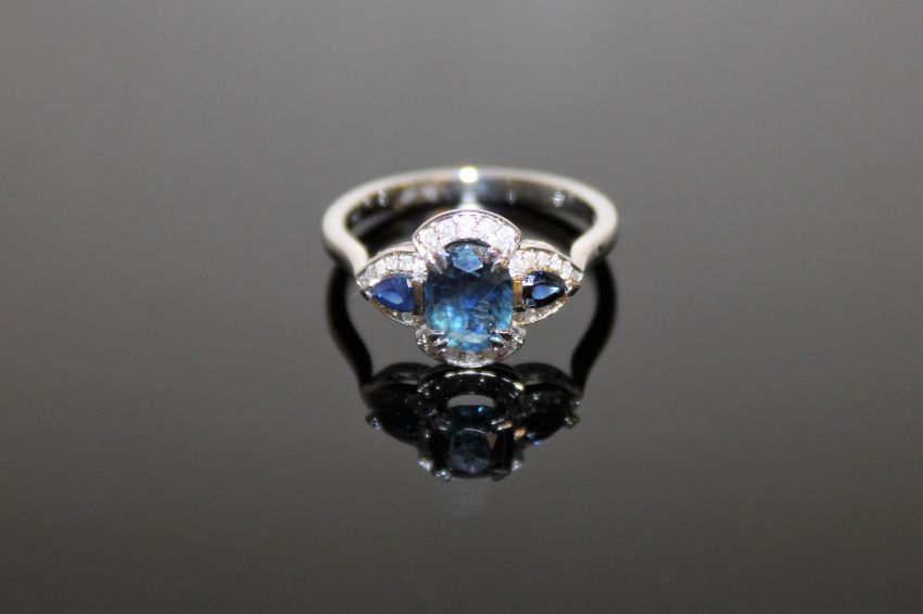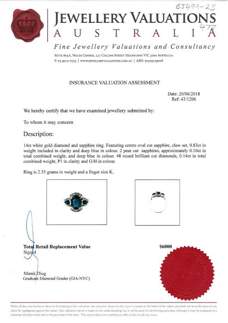 A 14ct white gold sapphire and diamond ring, an oval-cut deep-blue sapphire weighing 0.83 carat, between two tear drop deep-blue sapphires weighing 0.10 carat in total, bordered by forty-eight brilliant-cut diamonds totalling 0.14 carat, of I clarity and G colour, with certification, size J/K