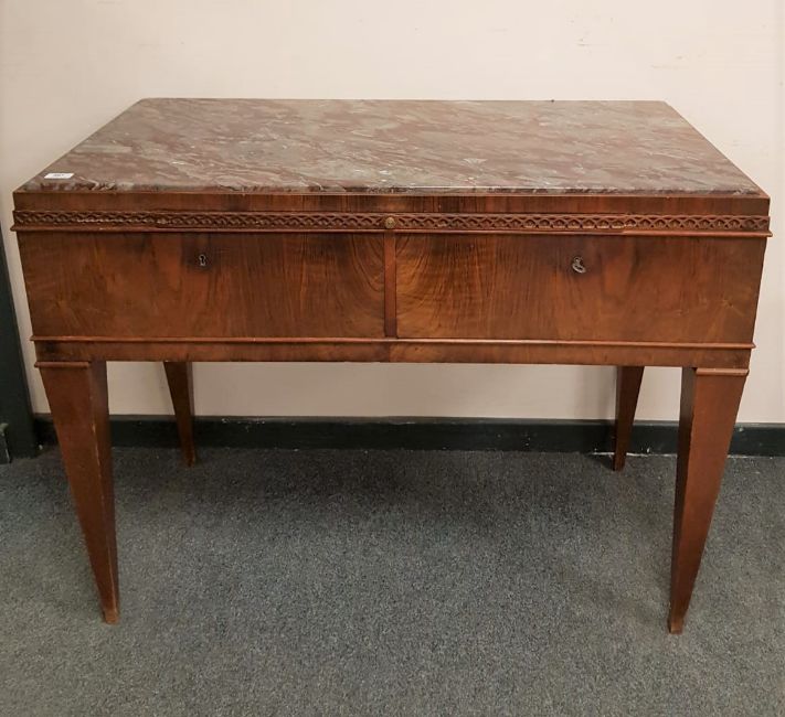 An early 20th century continental mahogany marble topped serving table, width 111 cm