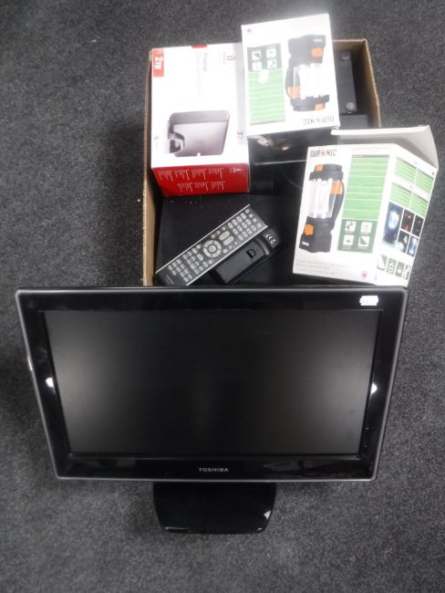 A box containing a desk top hard drive, two outdoor camping lights, Panasonic HD box, Polaroid micro hifi system, together with a Toshiba 22" LCD TV