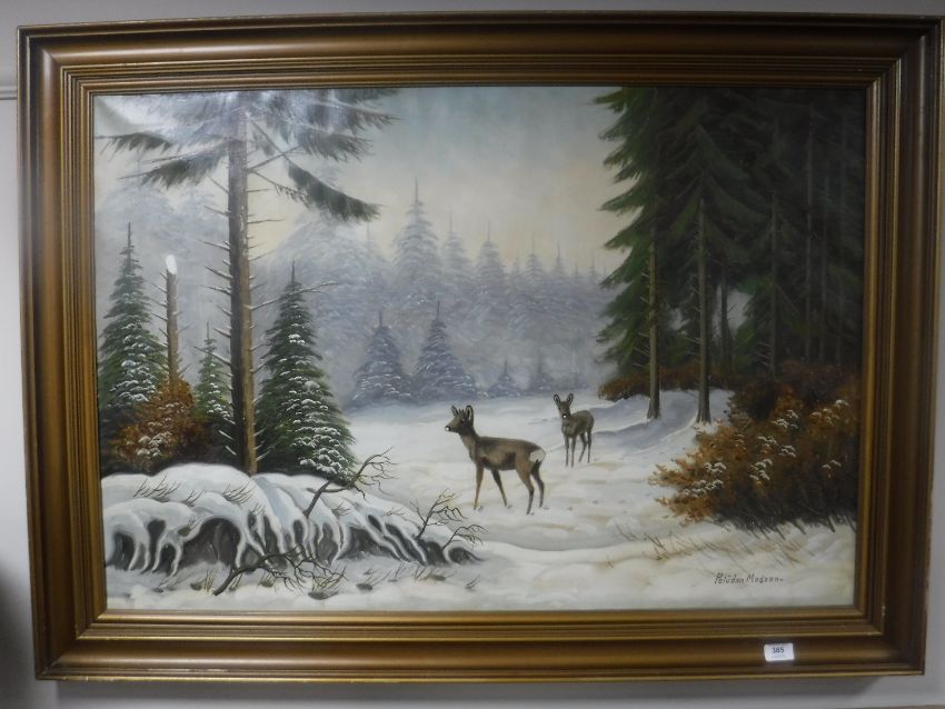 A gilt framed continental school oil on canvas, deer in winter landscape, signed Madsen
