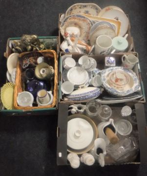 Four boxes of miscellaneous china including dinner and tea ware, glass ware, cherub figure etc
