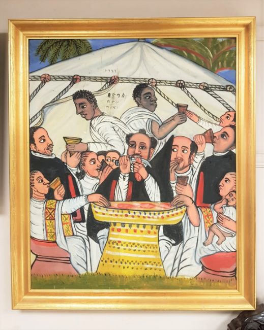 Middle Eastern School : Figures around a table, oil on canvas, 78 cm x 64 cm, framed.