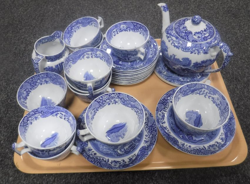 A tray containing twenty-six pieces of Spode blue and white tea china