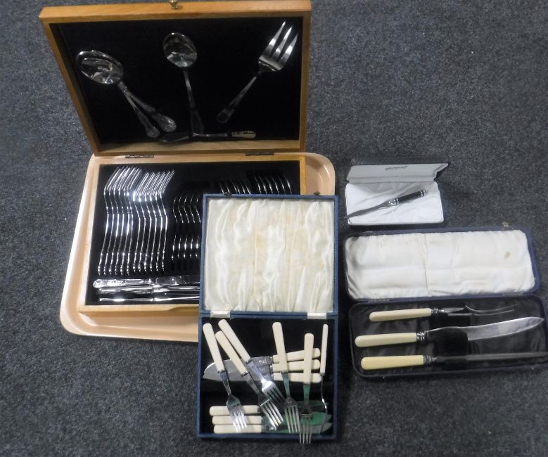 A tray containing oak canteen of stainless steel cutlery, cased servers, cased letter opener etc