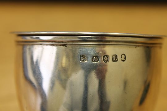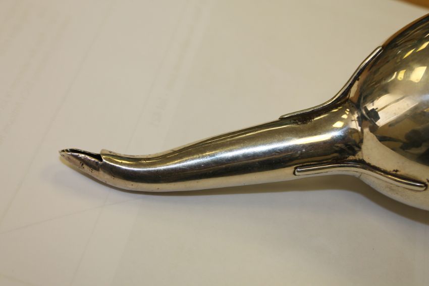 161g. Length 15cm. The bowl of the funnel measures 7cm in diameter. Two or three very shallow dents to the bowl but overall in excellent condition.