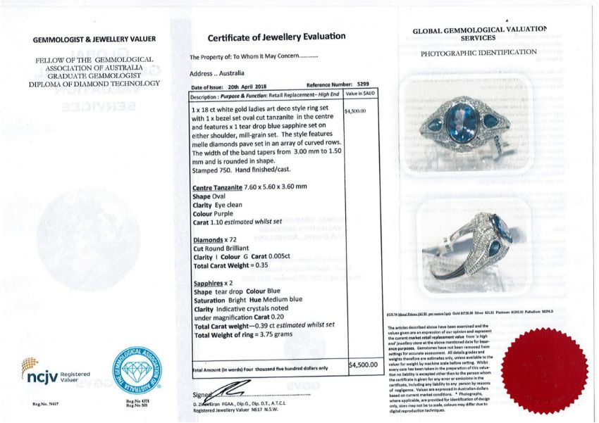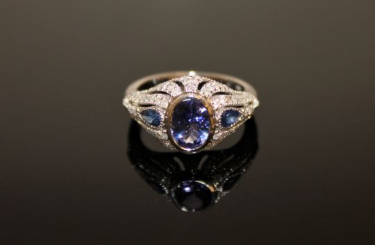 A 14ct white gold tanzanite, sapphire and diamond Art Deco style ring, the oval-cut tanzanite weighing 1.10 carat, between two tear drop shaped blue sapphires weighing 0.39 carat in total, with seventy-two millegrain set brilliant-cut diamonds totalling 0.35 carat, of I clarity and G colour, with certification, size J/K