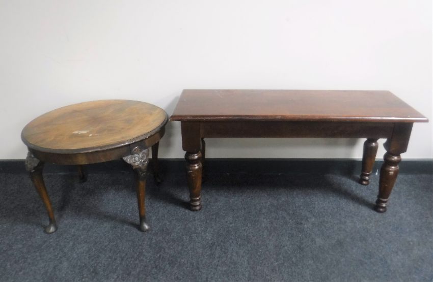 A pine bench together with a circular walnut coffee table