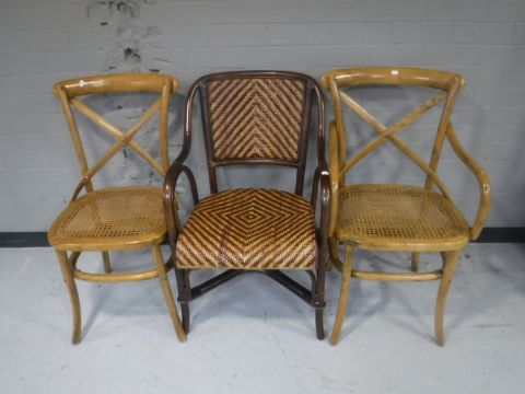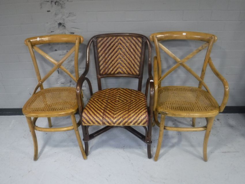 A square painted pine kitchen table together with a bentwood armchair, a bentwood single chair and a bamboo and wicker chair