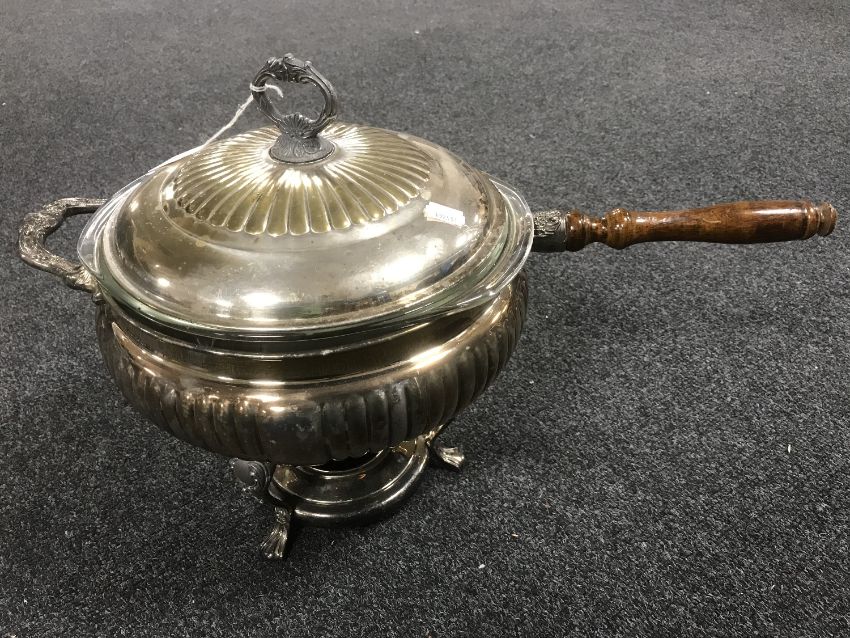 An antique silver plated long handled chafing dish with glass liner, on stand