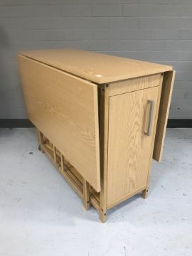 A contemporary drop leaf storage dining table together with four folding stowaway chairs